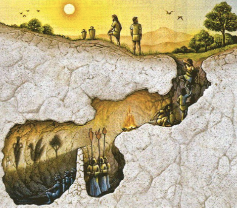 Wanneer de bevrijde mens in de allegorie zijn weg vindt naar het licht buiten de grot dan wil hij de andere gevangenen ook van het licht buiten de grot bewust maken. Hij keert dan ook terug in het donker. Zijn ogen moeten daar natuurlijk wennen. Bij zijn ouden vrienden teruggekeerd vertelt hij over een meer ware wereld buiten de grot. De geketende zijn net in een van hun geliefde spelletjes bezig: het raden van de volgende schaduw op de muur. Wanneer hij zoveel wijzer is, dan kan hij vast voorspellen wat er voor schaduw volgt. Het lukt hem, die het licht heeft gezien, echter niet de schaduwen te onderscheiden zo zijn zijn ogen veranderd. De geketenden bulderen van het lachen. Zijn onkunde bewijst voor hen zijn leugen. Als hij doorgaat met hen te bedriegen dan zullen ze hem nog doden!